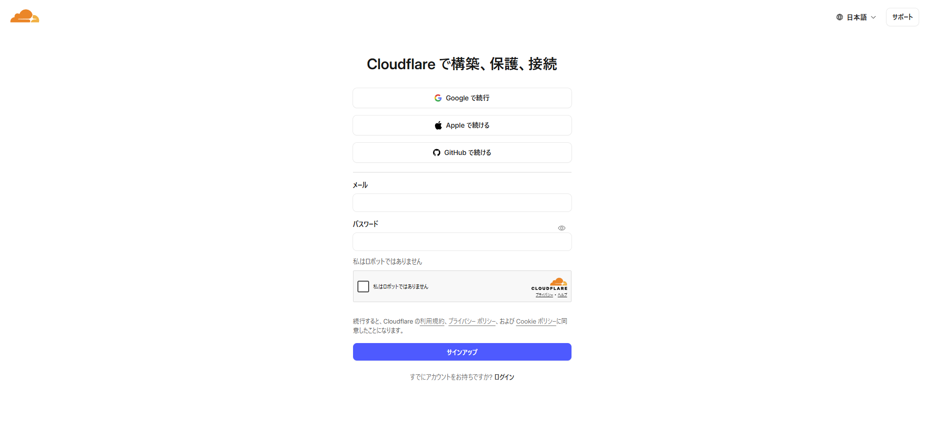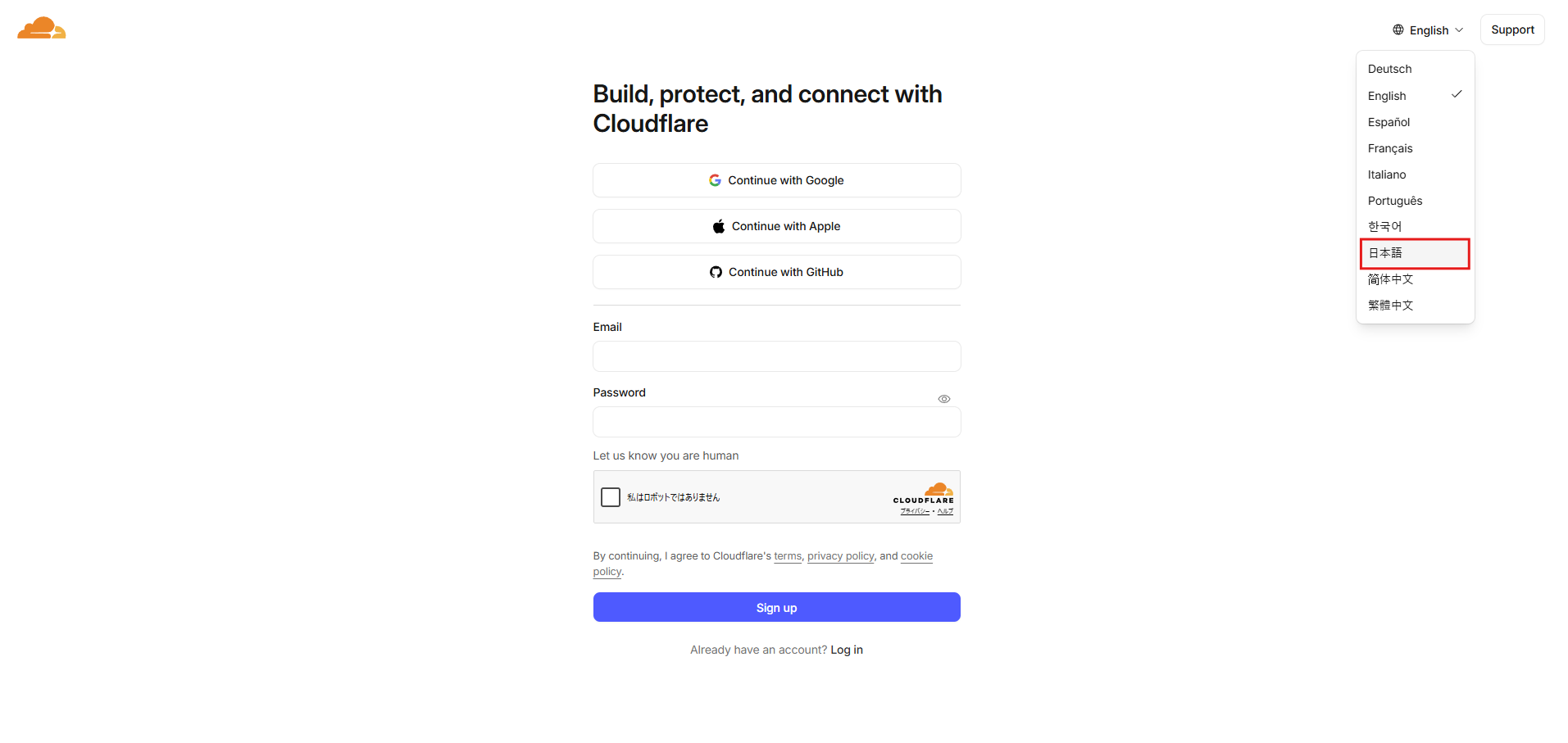 Cloudflareアカウント作成画面が表示されるため、右上の言語プルダウンを「日本語」に変更すると画面表示が日本化する