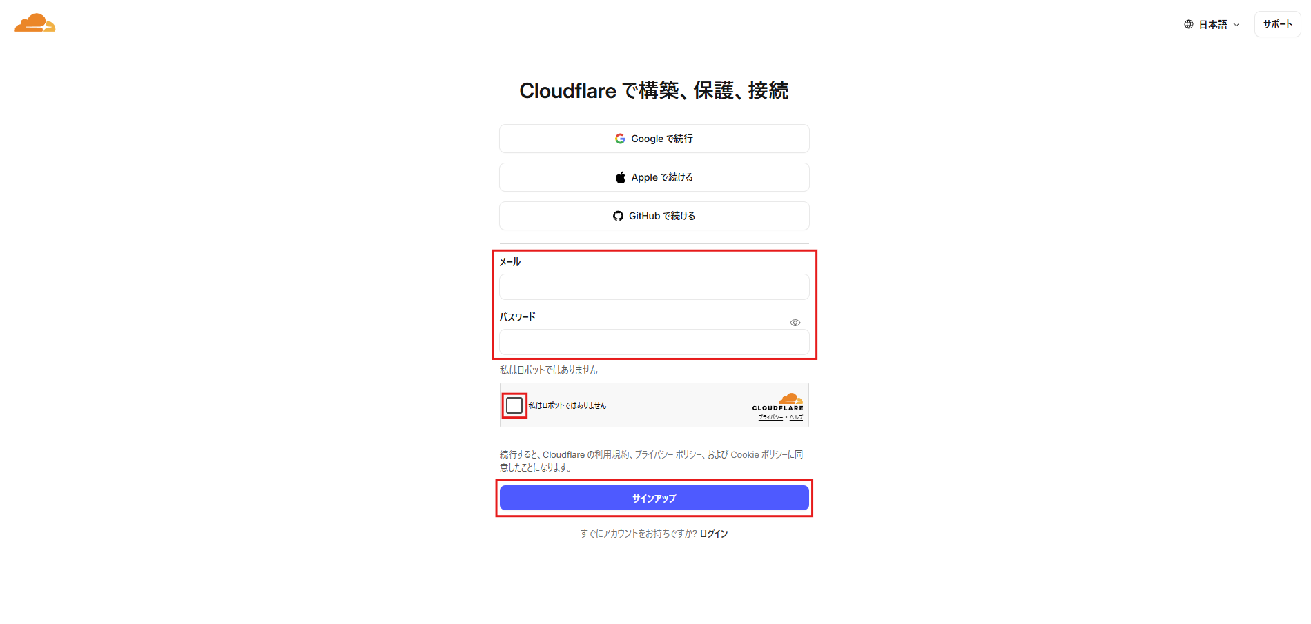 Cloudflareアカウント作成画面が表示されるため、右上の言語プルダウンを「日本語」に変更すると画面表示が日本化する操作の画面キャプチャ(日本語化後)