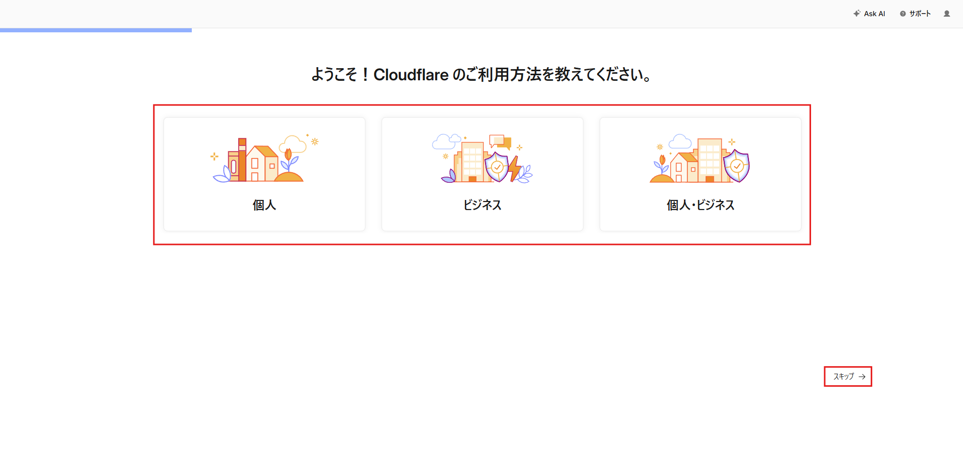 Cloudflareの利用方法を選択する画面が表示された場合、任意の選択肢を選ぶ操作の画面キャプチャ3