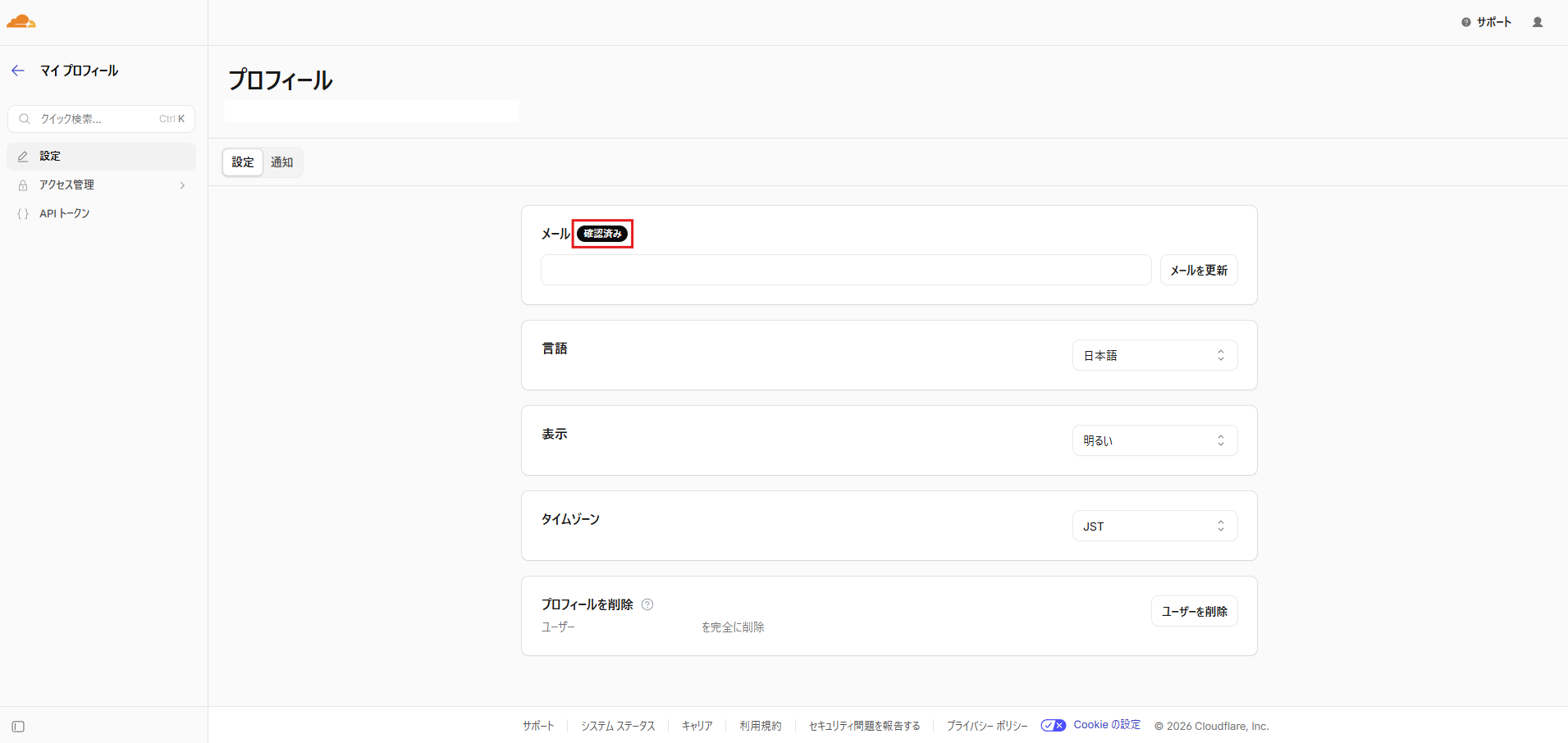 Cloudflareアカウントのホーム画面が表示されるため、右上のアイコンを押し、メニューの「プロフィール」を選ぶ
