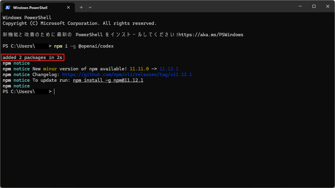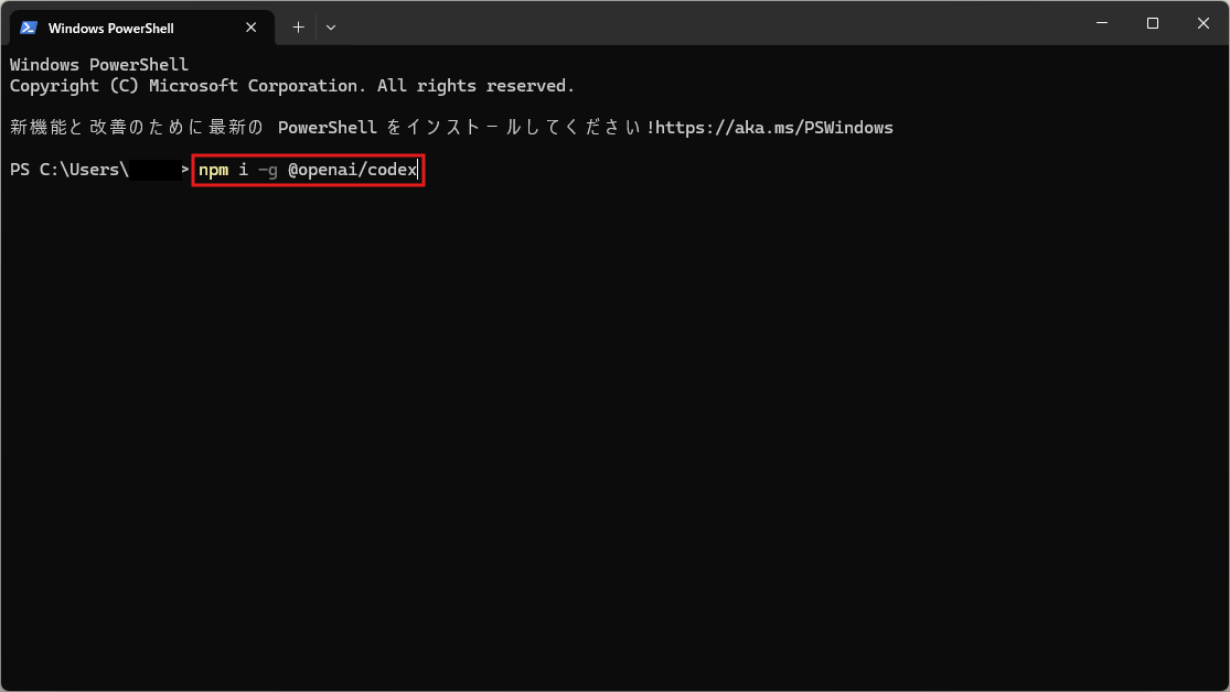 ターミナル(PowerShell)が表示されるため、以下のコマンドで「Codex CLI」をダウンロード・インストールする