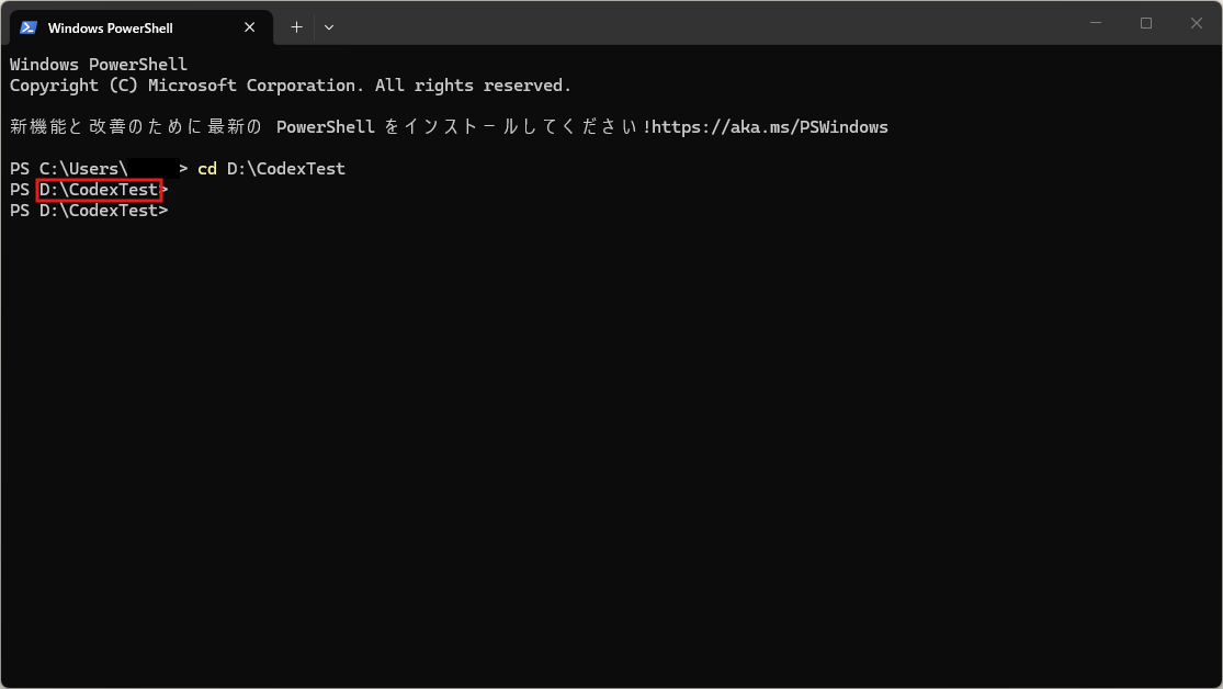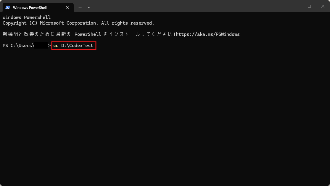 (任意)ターミナル(PowerShell)で「codex」コマンドを試し打ちする
