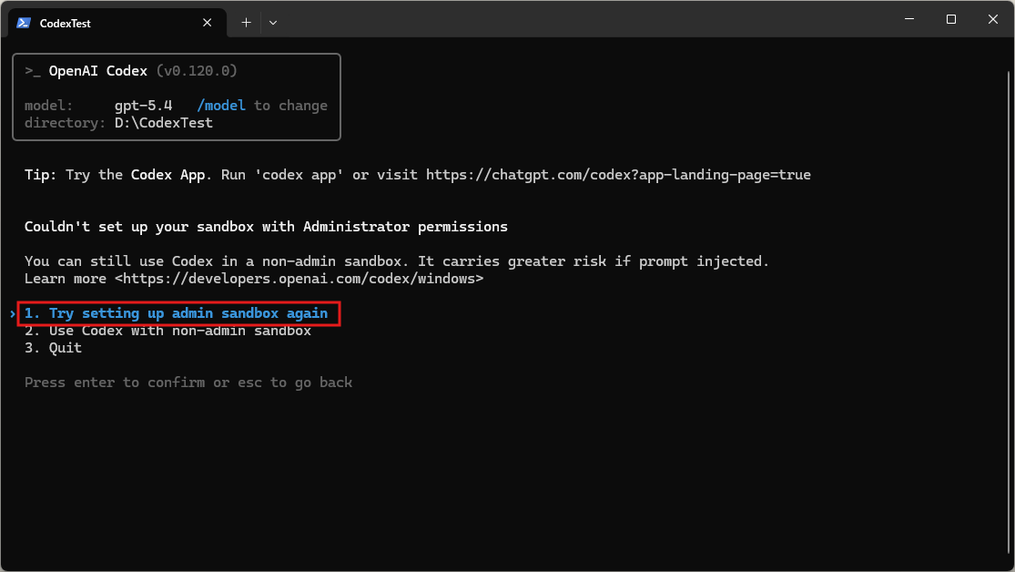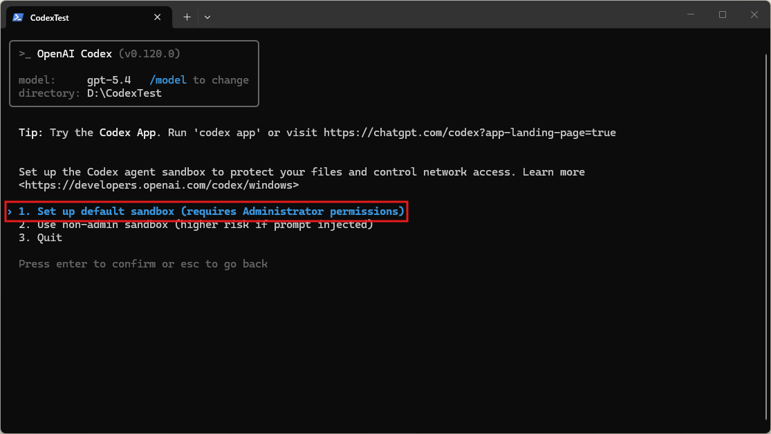 サンドボックスを設定するためのメッセージが表示されるため、「1. Set up default sandbox (requires Administrator permissions)」を選択し、「Enter」キーを押す