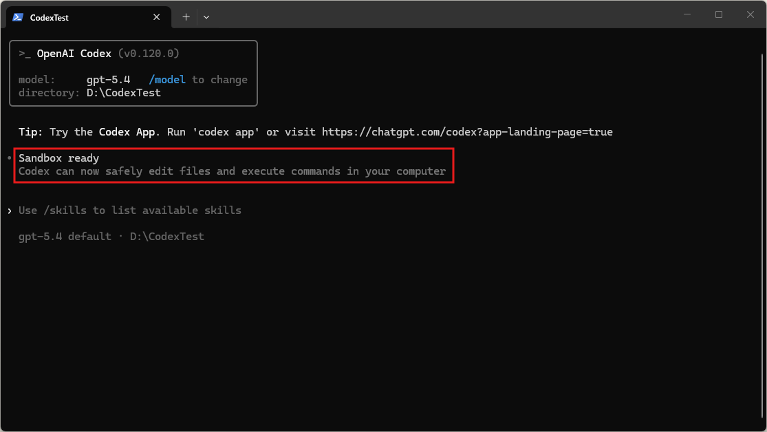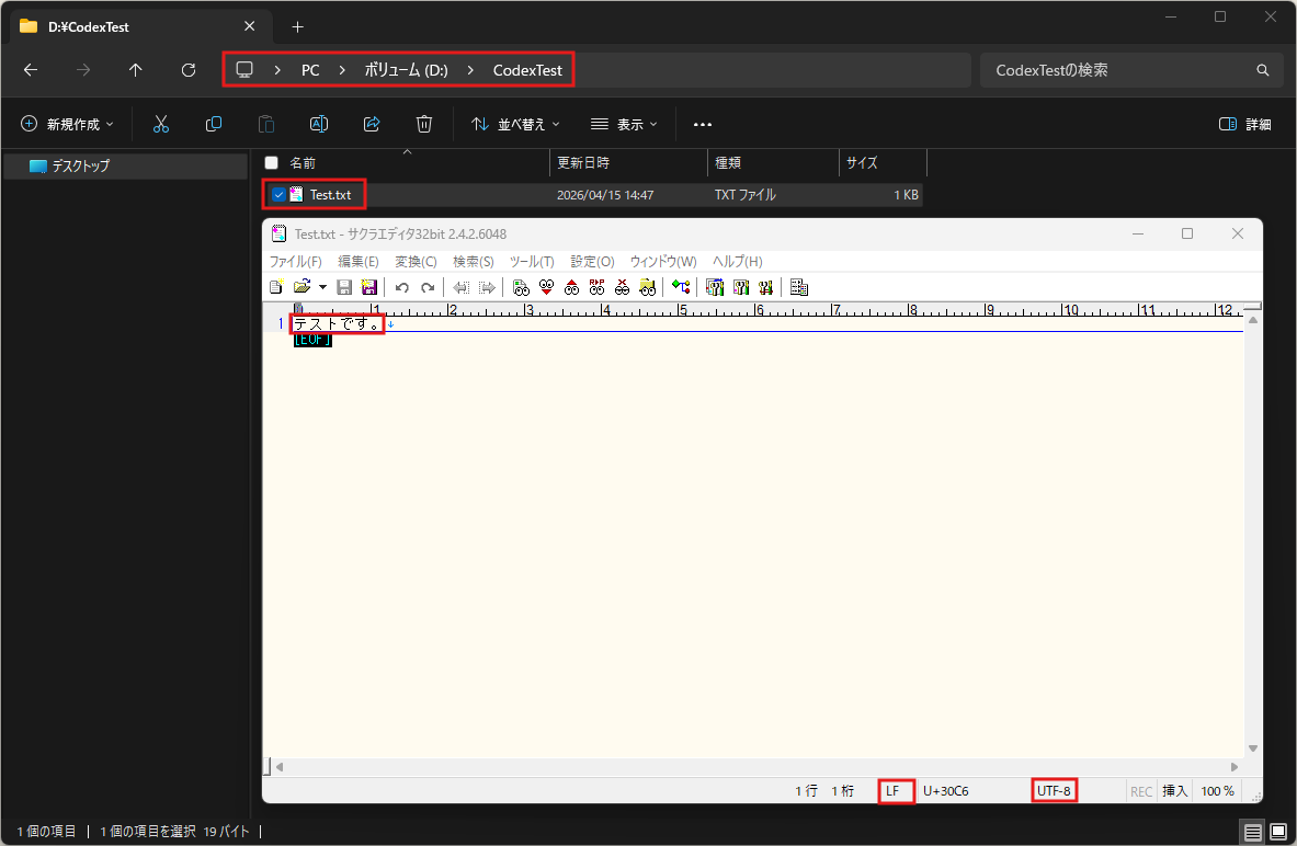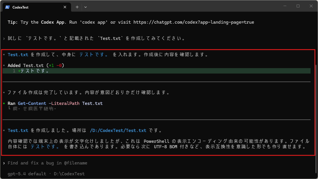 • Test.txt を作成しました。場所は /D:/CodexTest/Test.txt です。