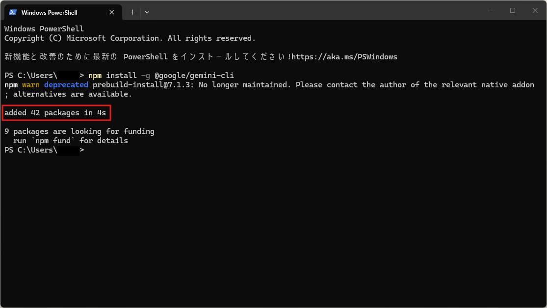 ターミナル(PowerShell)が表示されるため、以下のコマンドで「Gemini CLI」をダウンロード・インストールする