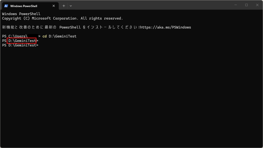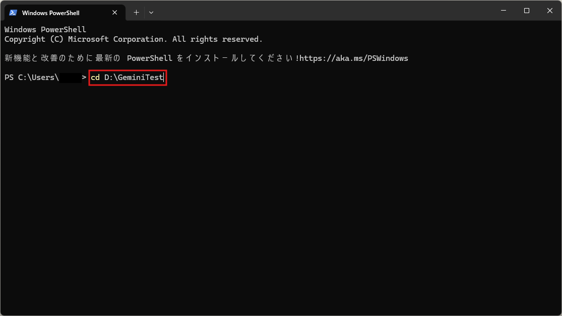 (任意)ターミナル(PowerShell)で「gemini」コマンドを試し打ちする