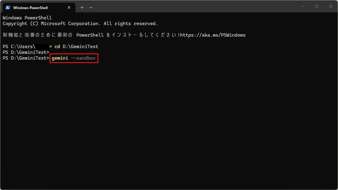 - (任意)ターミナル(PowerShell)で「gemini」コマンドを試し打ちする
