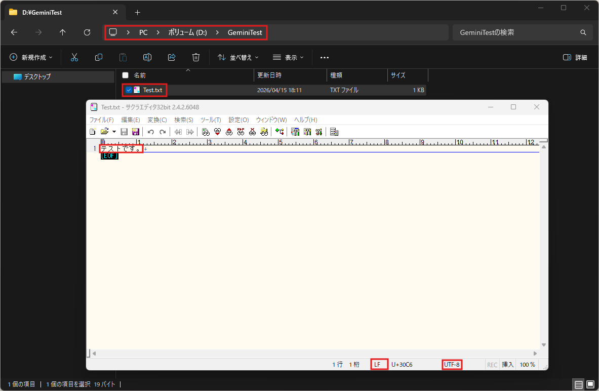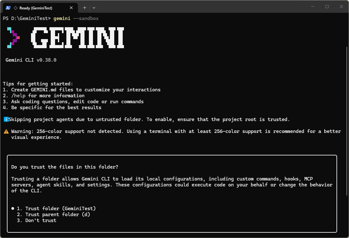 作業フォルダ内のファイルを信頼するか確認するメッセージが表示されるため、「1. Trust folder (GeminiTest)(GeminiTestフォルダを信頼する)」を選択し、「Enter」キーを押す