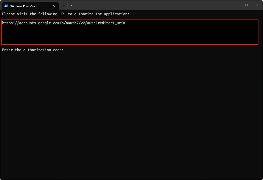 Googleでログインするための認証画面URLが表示されるため、URLをコピー&ペーストし、ブラウザのアドレスバーに入力後、「Enter」キーを押す