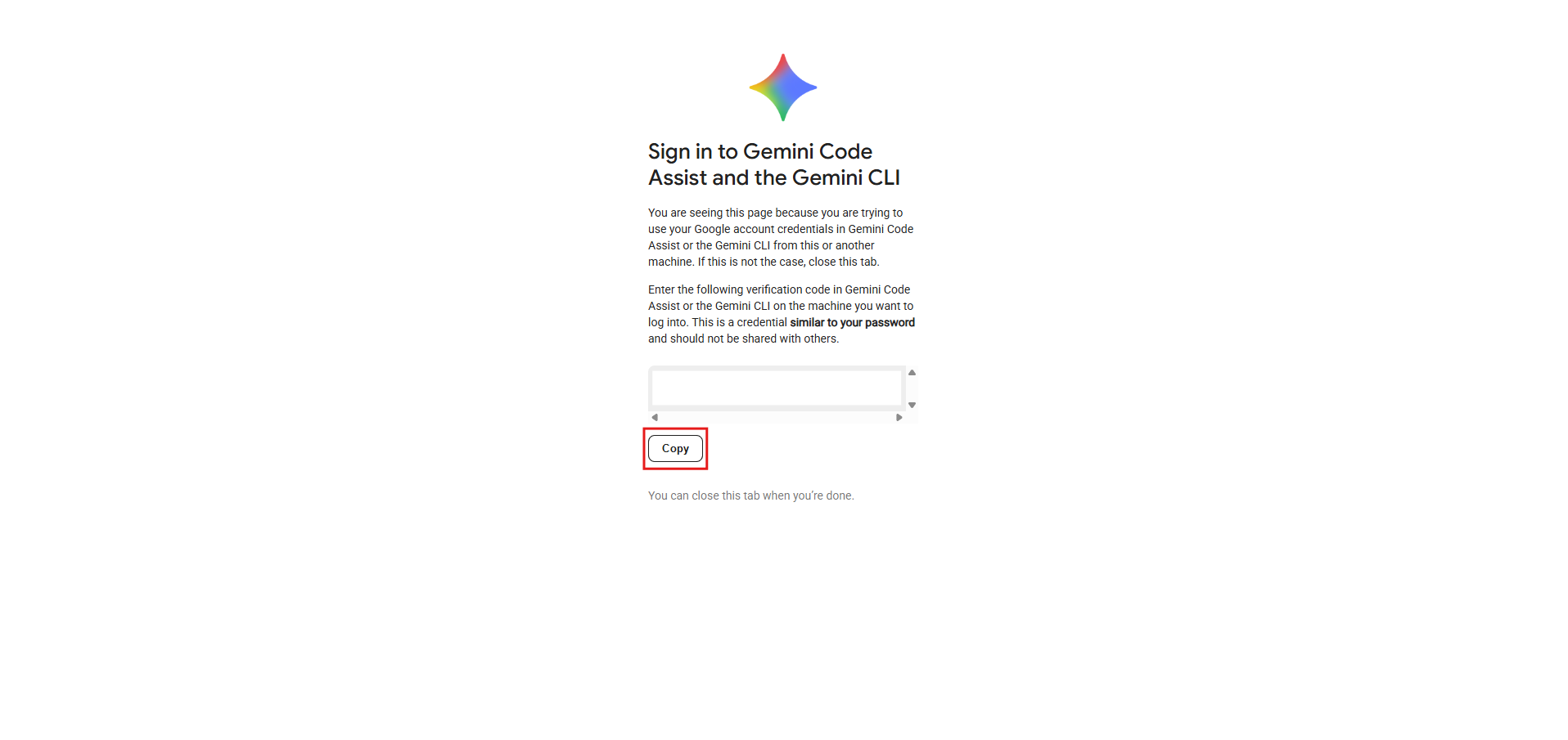 - Gemini CLIの認証で使用する検証コードが表示されるため、「Copy」ボタンを押し、ブラウザを閉じる