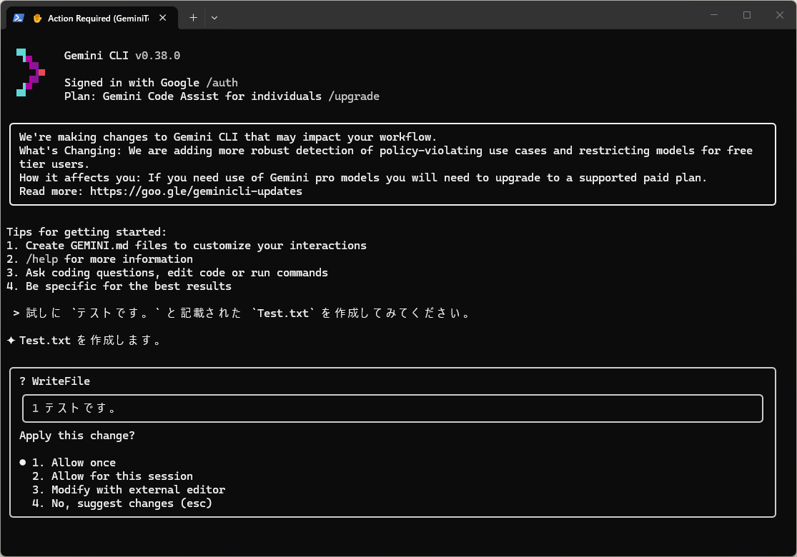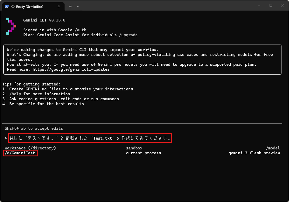 - Geimini CLIに指示(プロンプト)を試し打ちする