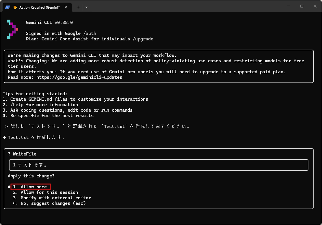 ファイルの変更許可を求められるため、「1. Allow once(1回のみ許可する)」を選択し、「Enter」キーを押す