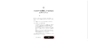 ChatGPTを使用してPyCharmにサインインするか確認されるため、「続行」ボタンを押す