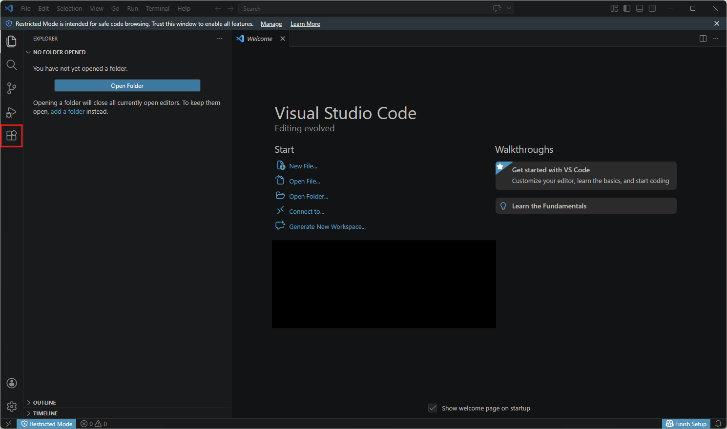 Visual Studio Codeで左サイドメニューの「Extensions(拡張機能)」のボタンを押す