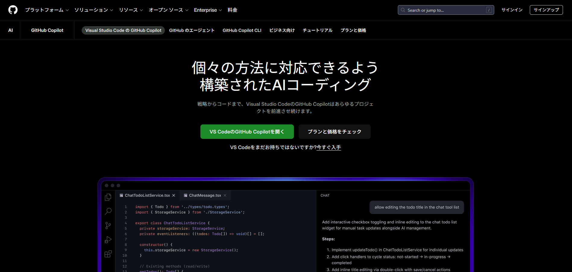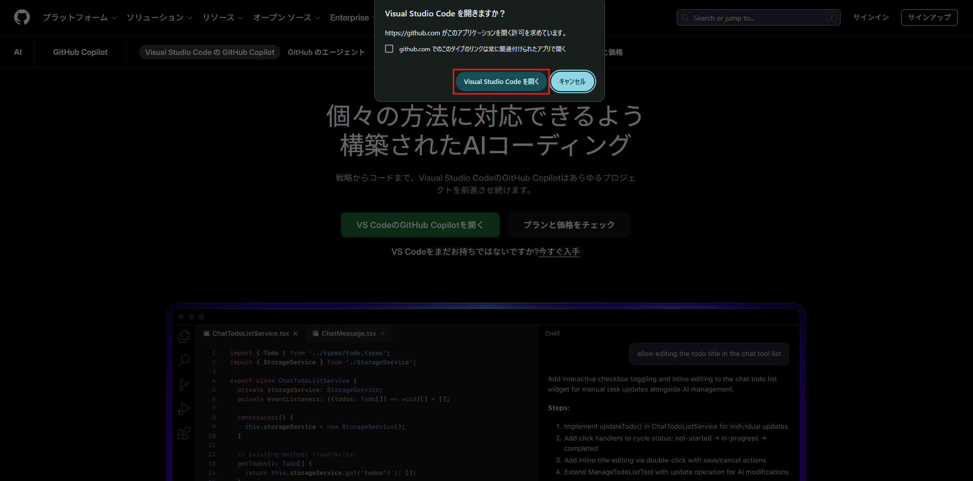 GitHub公式サイトの「Visual Studio CodeのGitHub Copilot」ページを開く