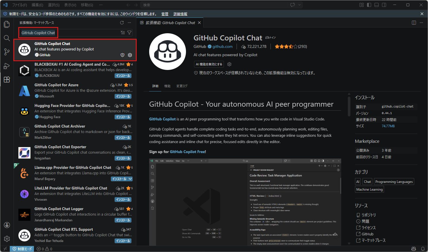 「GitHub Copilot Chat」拡張機能のページが表示されるため、拡張機能の有効化ボタンが「AI 機能を無効にする」と表示されていることを確認する