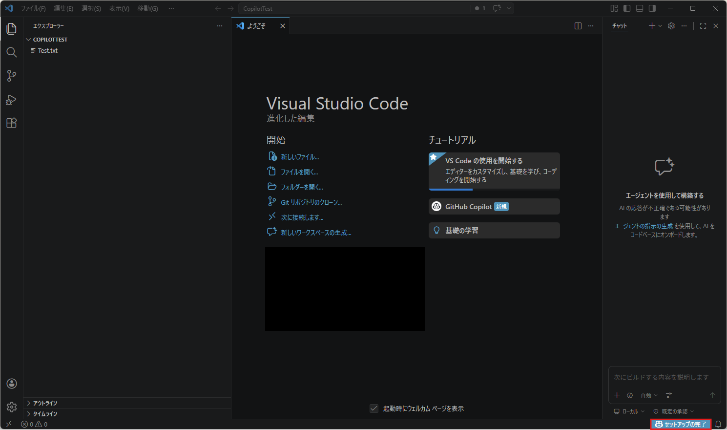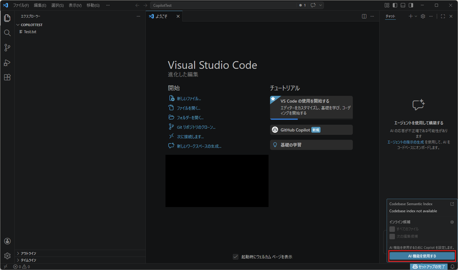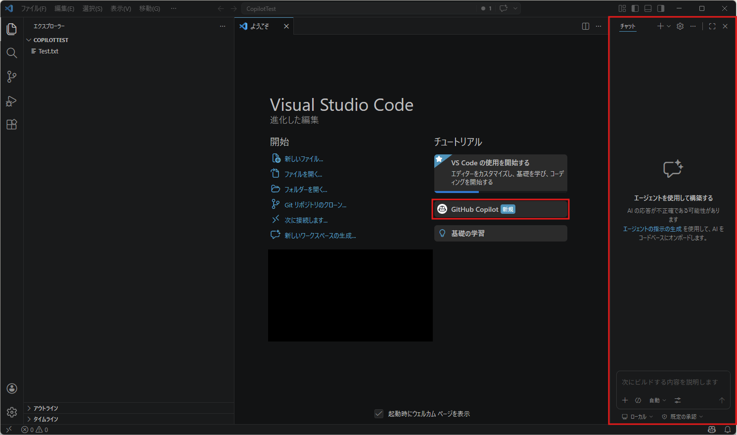ようこそページのチュートリアルのエリアに「GitHub Copilot」のボタンが表示され、右サイドにチャット画面が表示される