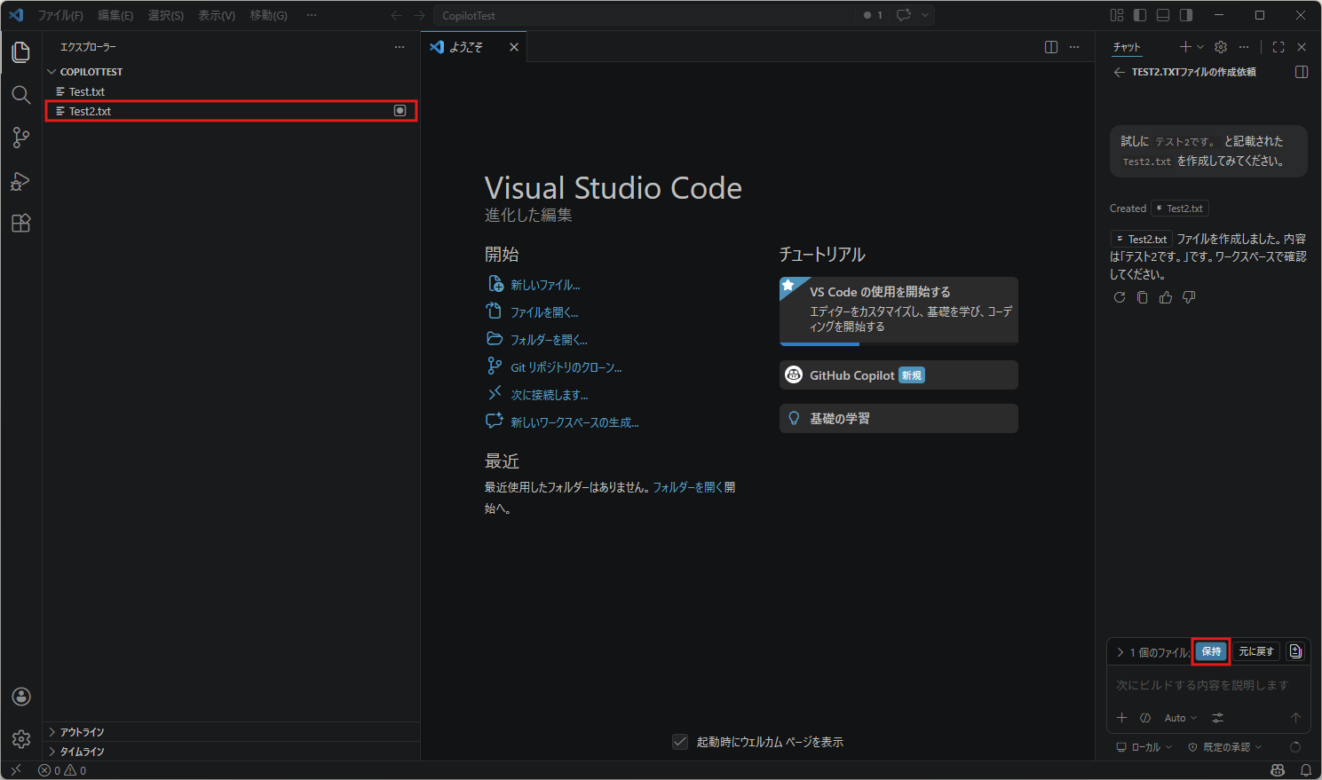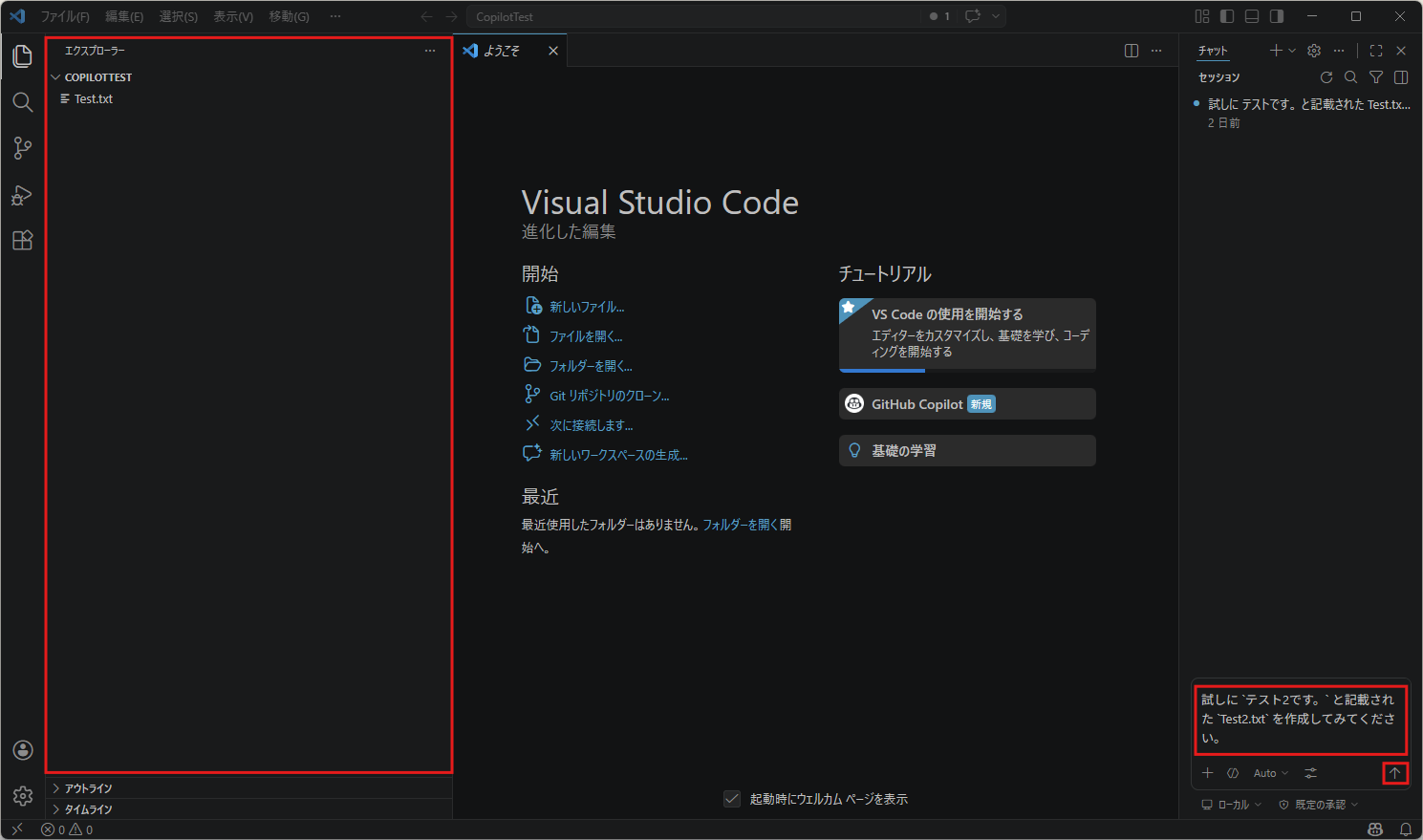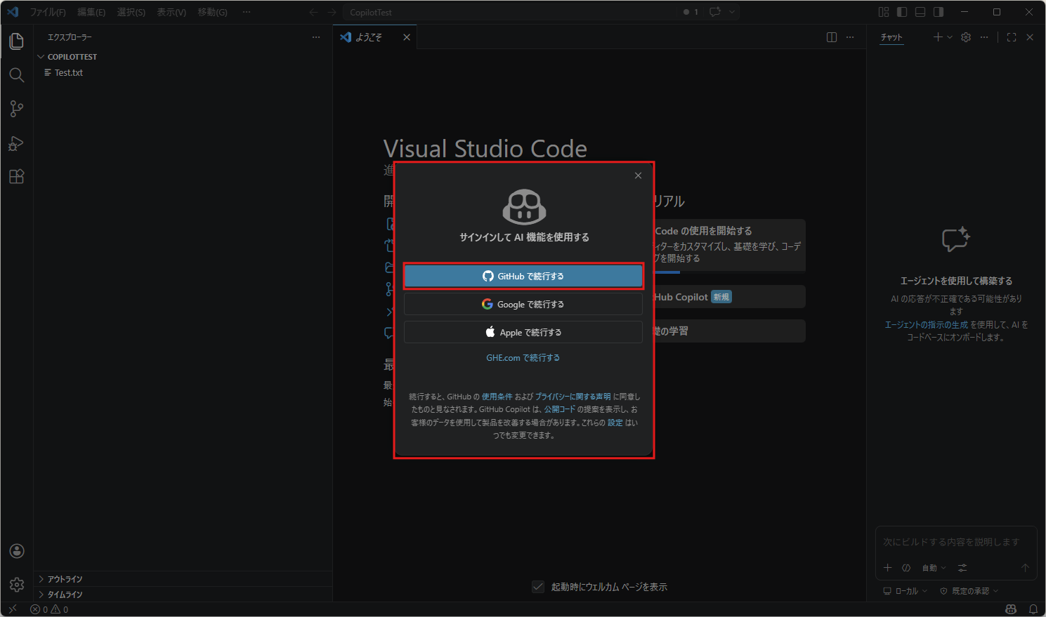 ようこそページのチュートリアルのエリアに「GitHub Copilot」のボタンが表示され、右サイドにチャット画面が表示される