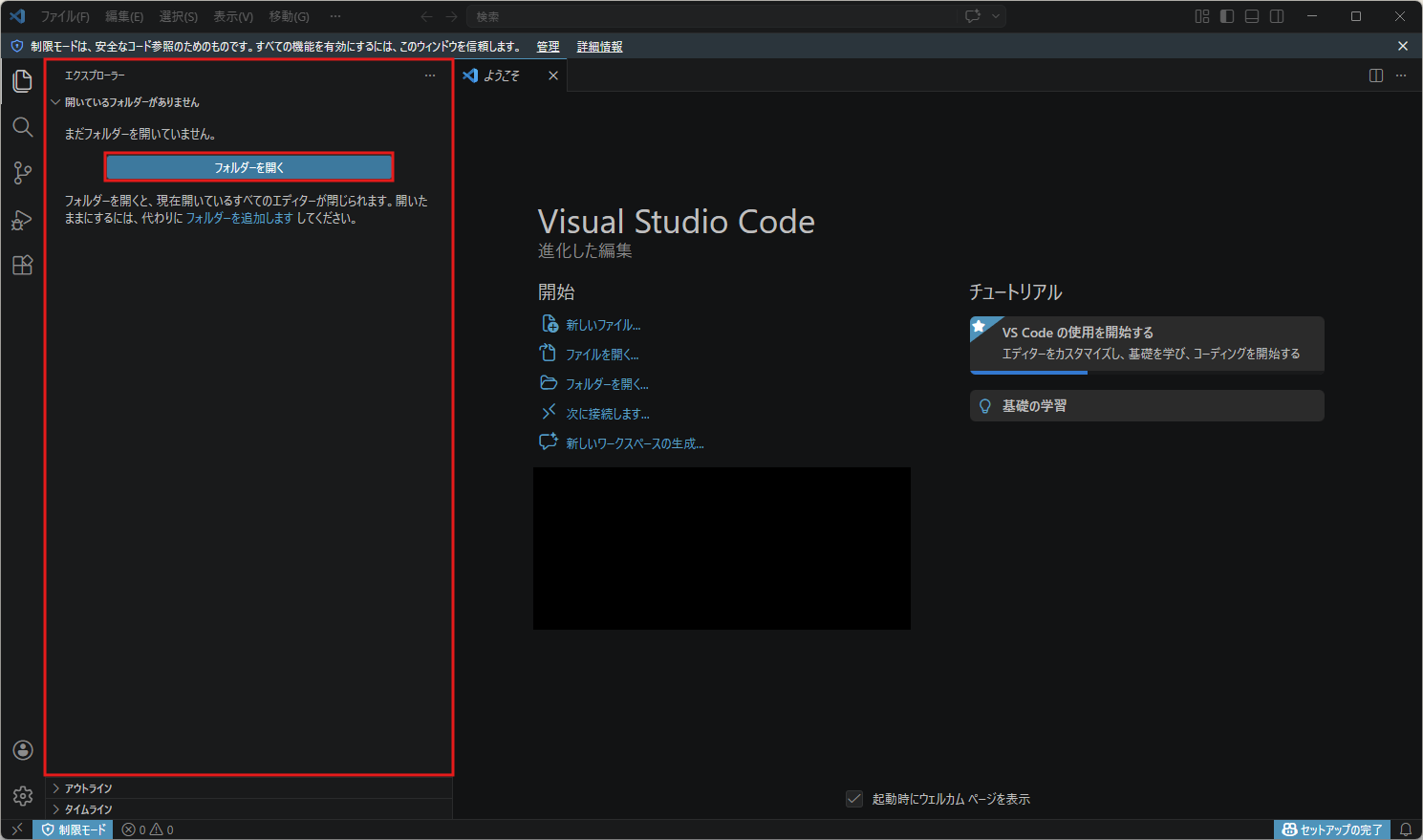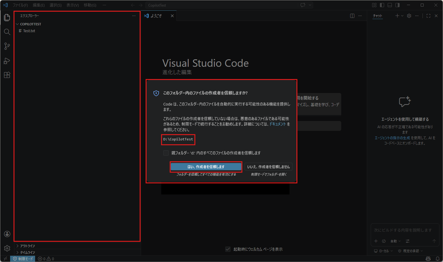 「エクスプローラー」の画面に選択した作業フォルダの中身が表示され、「このフォルダー内のファイルの作成者を信頼しますか?」という確認メッセージが表示されるため、「はい、作成者を信頼します」ボタンを押す