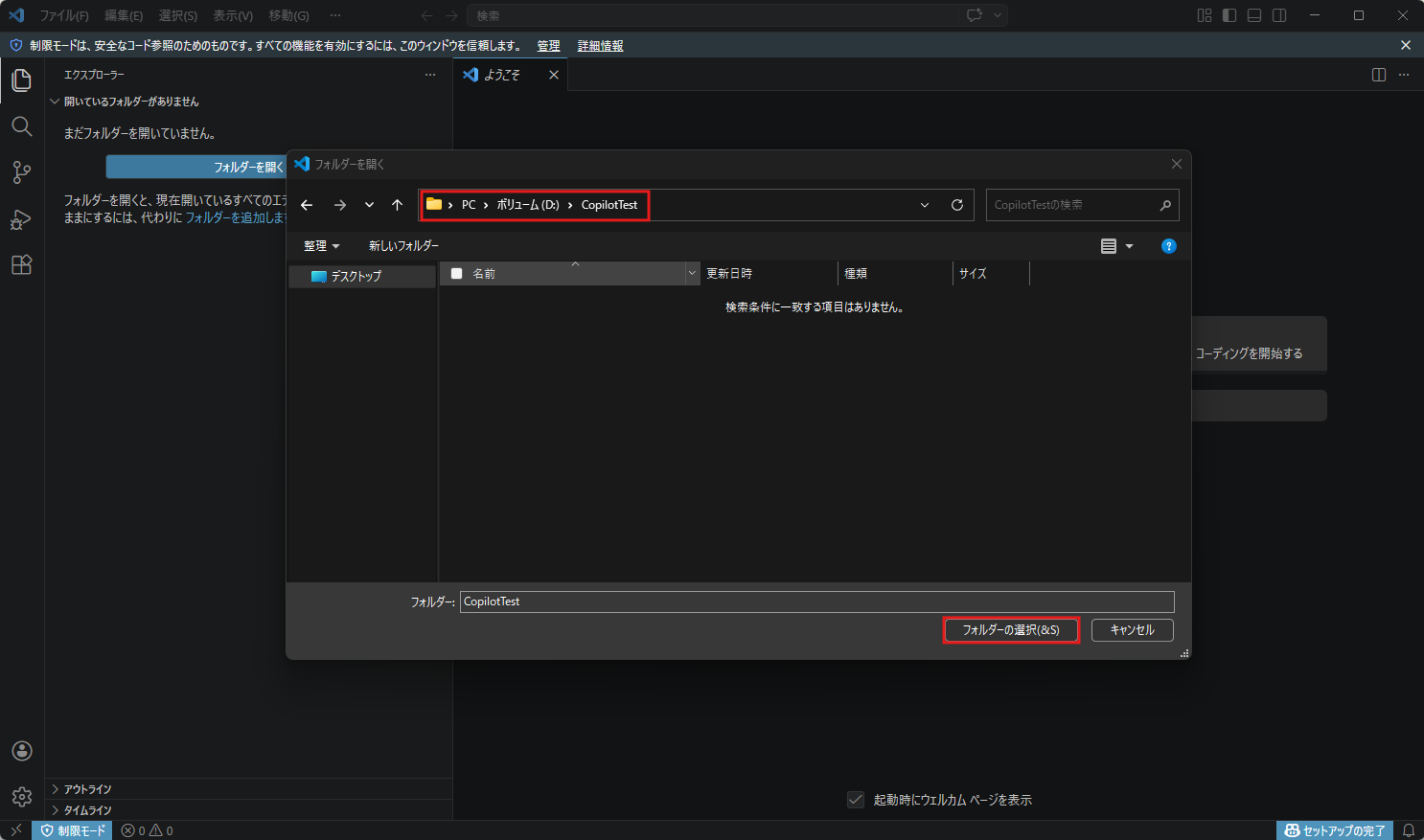 Visual Studio CodeでGitHub Copilotを使用する任意の作業フォルダを開く
