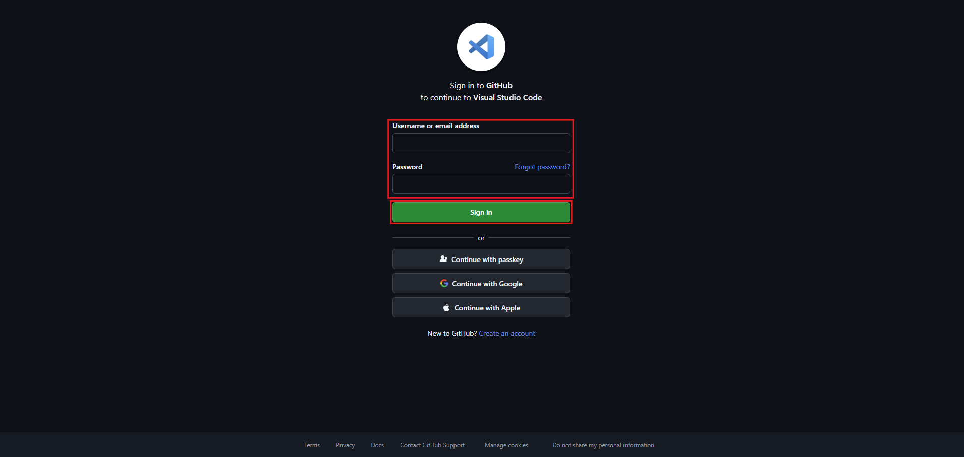 - Githubの認証画面が表示されるため、「Username or email address(ユーザー名またはメールアドレス)」と「Password(パスワード)」を入力し、「Sign in(サインイン)」ボタンを押す