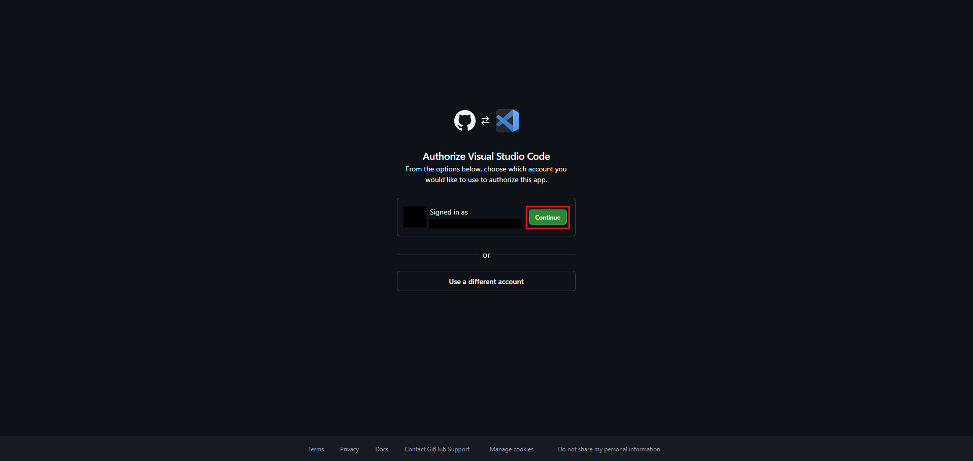GitHubアカウントへのサインイン画面が表示されるため、認証に使用する任意のアカウントの「Continue(続ける)」ボタンを押す