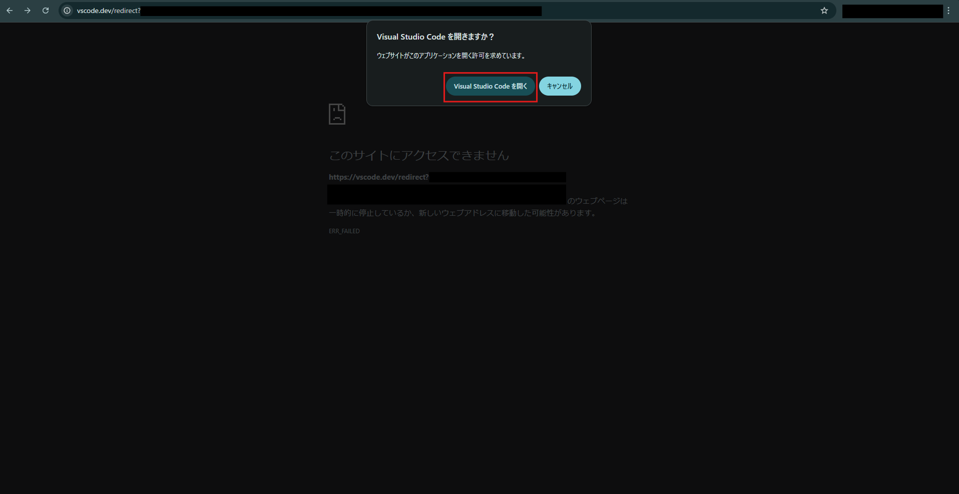 ポップアップ画面に確認メッセージが表示されるため、「Visual Studio Code を開く」ボタンを押す